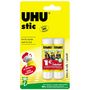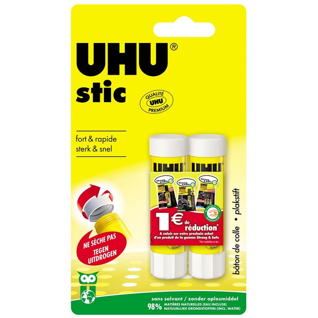 Lot de 2 bâtons de colle stick UHU. Bâton de colle blanche pour un collage rapide et propre, utile à l'école comme à la maison ou bureau. Descriptif du produit : Facile à étaler , glisse parfaitement. Colle propre et rapide. Informations pratiques: Sans solvant, couleur transparente, lavable à l’eau.