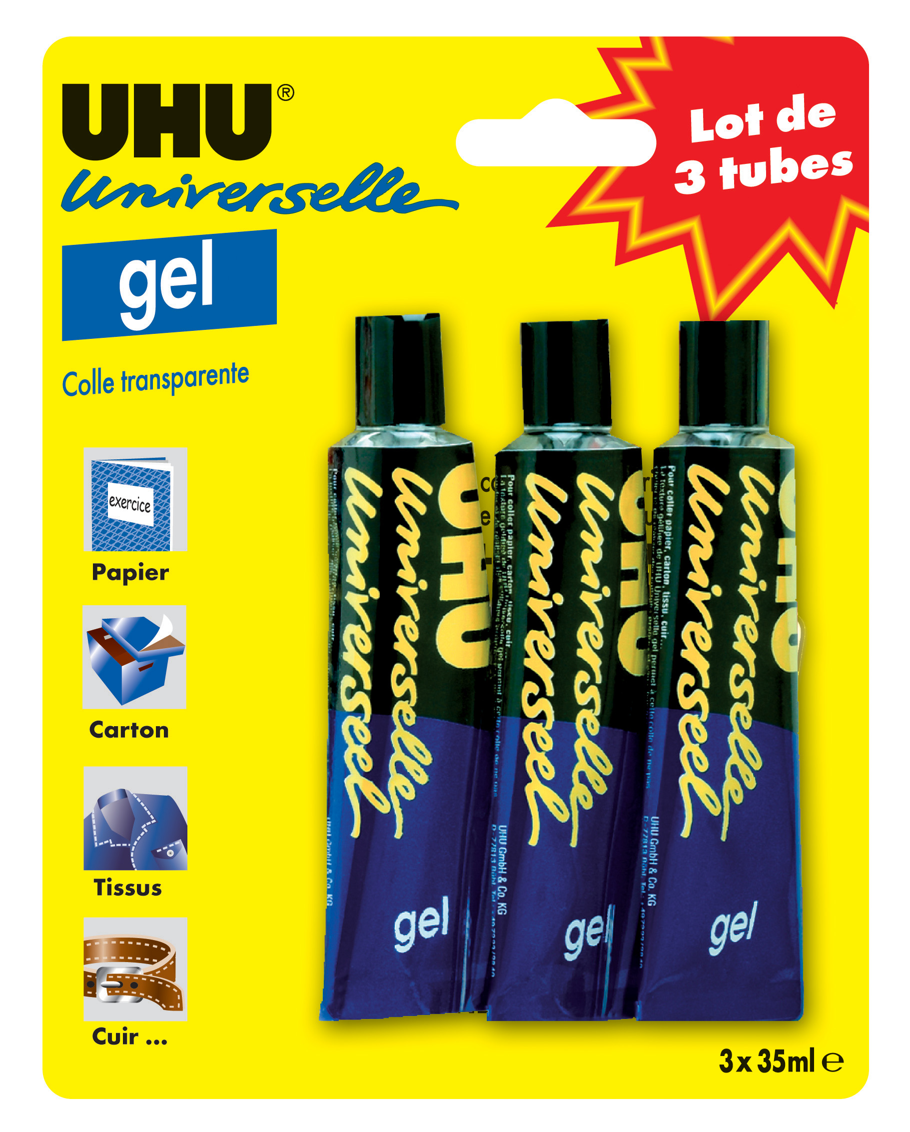 En savoir +Lot de 3 colle en gel 35ml. Pour coller porcelaine, bois, métal, verre, céramique, Plexiglas, feutre, cuir, liège, tissus et textiles, carton, papier. Ne goutte pas,débit contrôlé.