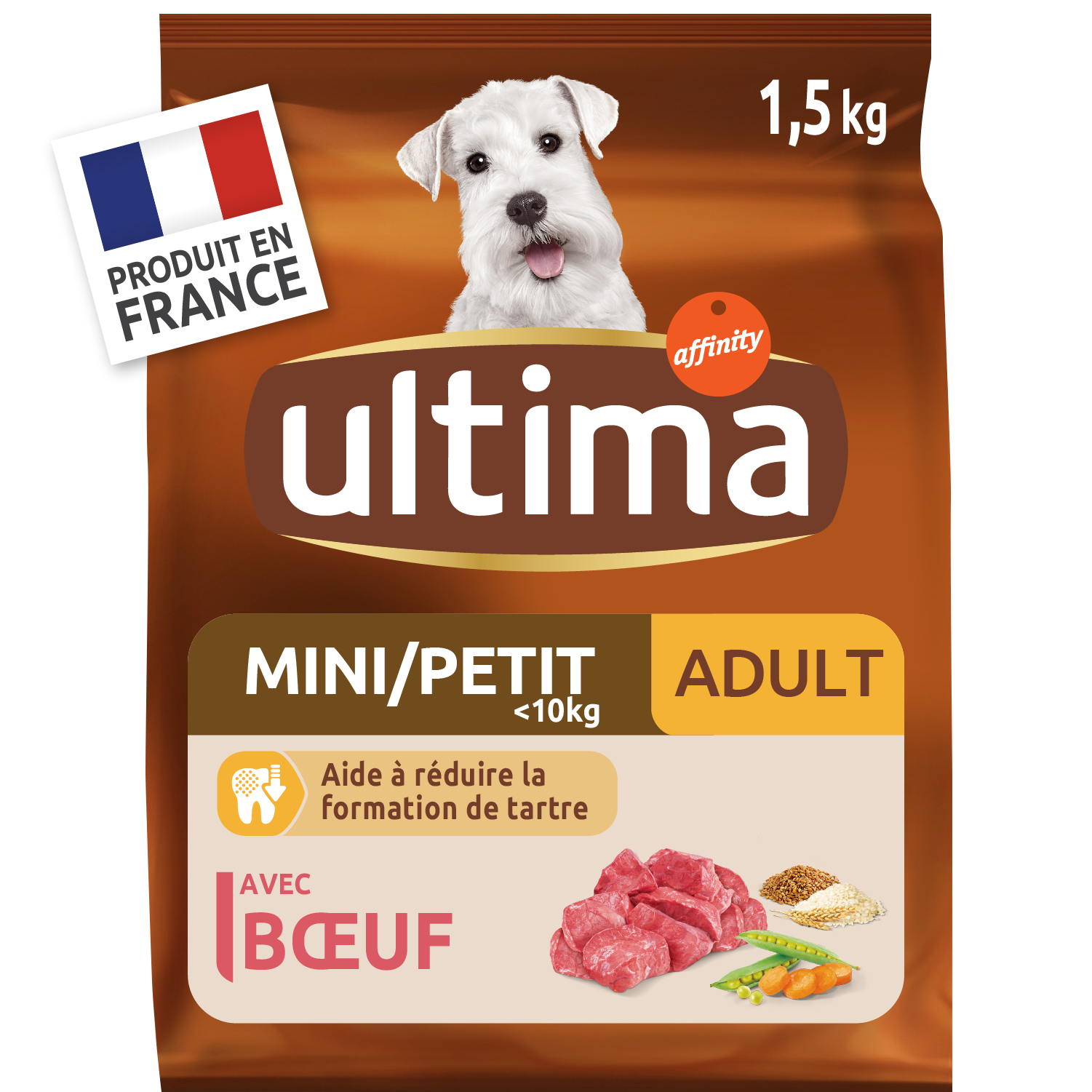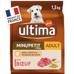 ULTIMA croquettes Chien Mini Adulte Bœuf - 1,5 kgs Les chiens adultes (jusqu'à 8 ans) de petite taille (jusqu'à 10 kg) possèdent généralement un métabolisme différent. Ultima Mini Adult est une recette contenant des protéines, des vitamines et des minéraux. Elle est adaptée aux besoins nutritionnels de votre chien pour qu'il reste dynamique et en pleine forme. Elle aide également à réduire la formation de tartre.