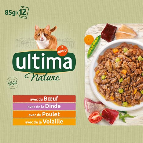 Ultima Nature prend soin naturellement de ceux que vous aimez le plus. Ultima Nature, l’équilibre parfait d’une recette à la fois saine et savoureuse, 100% complète et équilibrée, élaborée avec des ingrédients naturels soigneusement sélectionnés.Tous les ingrédients sont cuits à la vapeur afin de conserver leurs propriétés nutritionnnelles. Sans colorants, sans conservateurs et sans arômes artificiels.Protéines de haute qualité: Boeuf, Dinde, Poulet et Volaille. Légumes: tomates, haricots vertsUltima est un aliment à haute valeur nutritive, les quantités recommandées sont donc réduites. Les quantités d'aliments conseillées sont données à titre purement indicatif. Elles doivent être ajustées selon la condition physique, le niveau d'activité et les conditions météorologiques. ULTIMA Nature sachet fraîcheur Chat Multipack Viande - 12x85 g