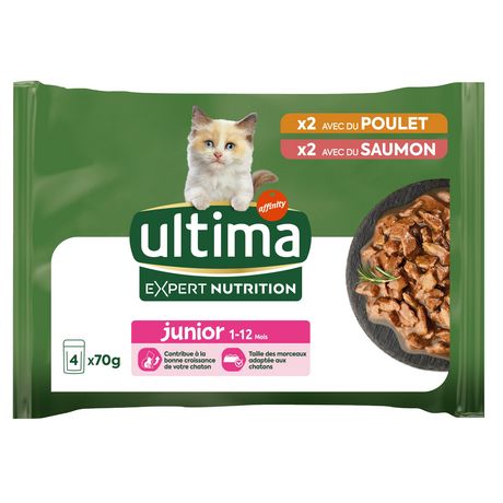 Notre recette Ultima Expert Nutrition Junior est composée d'ingrédients de haute qualité qui contribuent à la bonne croissance des chatons et dont les morceaux sont plus petits et adaptés à leur taille.