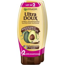 Après-shampooing crème riche Garnier Ultra DOUX à l'huile d'avocat et au beurre de karité pour cheveux très secs ou frisés. Résultat : extrêmement faciles à coiffer, vos cheveux retrouvent une douceur irrésistible. Sans être alourdis, ils sont nourris en profondeur, sont vraiment plus brillants et regorgent de santé. Garnier Ultra Doux Avocat et Beurre de Karité Démêlant nourrissant 400.0MLT