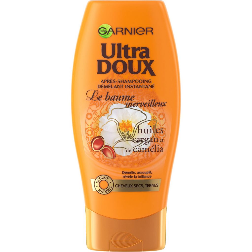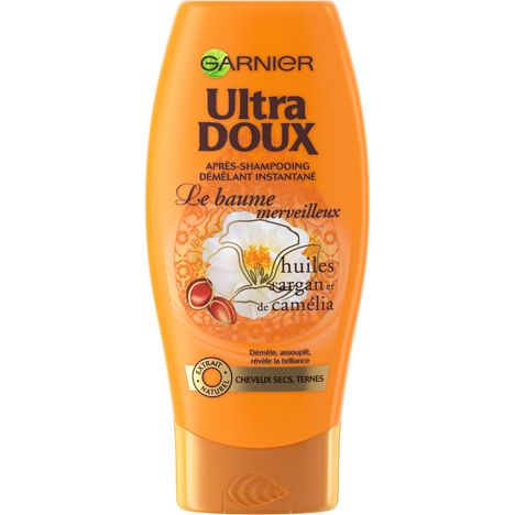 Après-shampooing Garnier Ultra DOUX aux huiles d'argan et de camélia pour cheveux secs. Résultat : démêlés et nourris jusqu'aux pointes, vos cheveux retrouvent toute leur souplesse et leur douceur. Ils redeviennent brillants et sont vraiment plus faciles à coiffer. Ils resplendissent de beauté ! Garnier Ultra Doux Merveilleux Après-Shampooing Merveilleux Huiles d'Argan et Camélia 200.0ml