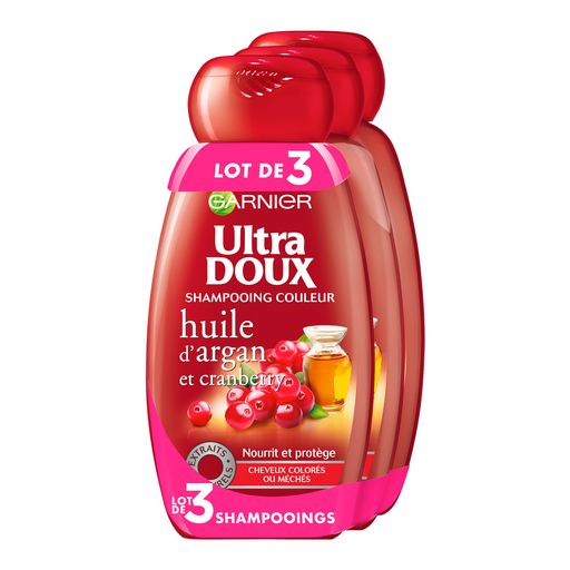 garnier, ultra doux, shampooing, huile d'argan, cranberry, nourrissant, cheveux colorés, cheveux méchés, lot de 2