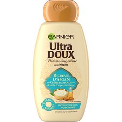 Shampooing nourrissant Garnier Ultra DOUX à l'huile d'argan et crème d'amande pour cheveux très secs et indisciplinés. Résultat : intensément nourris, vos cheveux sont souples et infiniment doux au toucher. Ils sont plus faciles à coiffer et resplendissent de beauté !