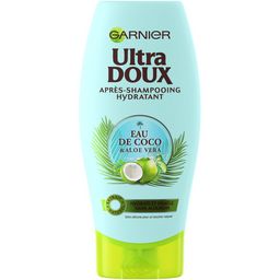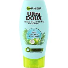 Soins démêlant hydratant Garnier Ultra DOUX à l'eau de coco et Aloe Vera pour hydrater et démêler les cheveux sans les alourdir. Formule sans silicone et sans paraben. Résultat : bien hydratés et démêlés, vos cheveux sont plus souples et infiniment plus doux au toucher. Légers et brillants, ils rayonnent de vitalité. Garnier Ultra Doux Eau de Coco et Aloe Après-Shampooing Eau de Coco et Aloe Vera 200 ml