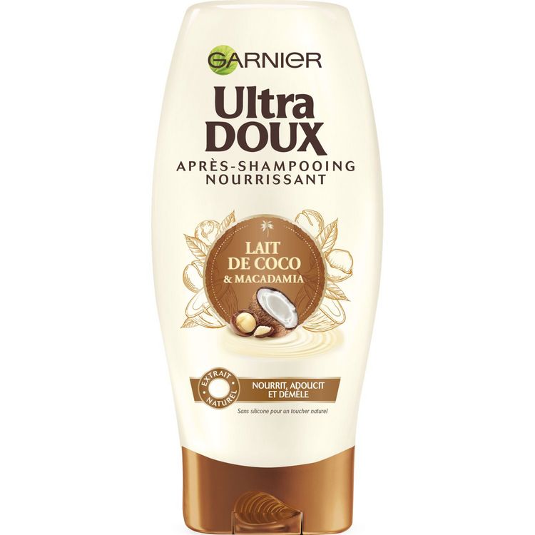 Après-shampooing nourrissant Garnier Ultra DOUX au lait de coco et macadamia pour nourrir, adoucir et démêler les cheveux. Résultat : intensément nourris et démêlés, vos cheveux sont plus souples, brillants, doux au toucher et rayonnent de beauté.
