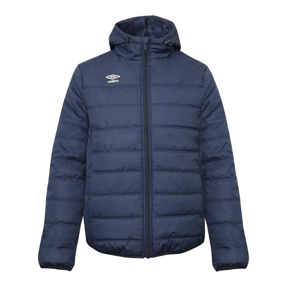 Doudoune pour homme de la marque Umbro ! Couleur : Marine Coupe altique Effet matelassé Capuche avec élastique de serrage Logo Umbro brodé Poche latérales boutonnées Composition : 100% polyester