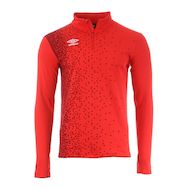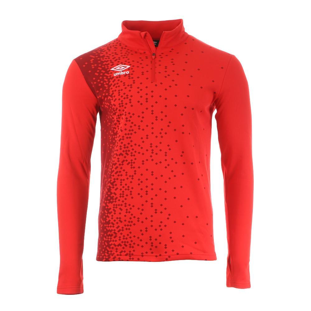 Optez pour le sweat 1/2 Zip de la marque UMBRO ! Coloris : Rouge Col montant avec 1/2 zip Manches longues Matière respirante Détail imprimé sur l'avant Logo Umbro brodé Composition : 100% Polyester