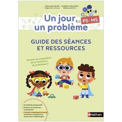Un jour, un problème PS/MS est un guide des séances et ressources qui propose un rituel quotidien pour devenir des superhéros de la résolution de problèmes ! 10 modules testés en alte pour accompagner les élèves pas à pas sur la voie de la réussite. Une démarche quotidienne et ritualisée qui va progressivement du jeu de rôle vers la manipulation, puis l'abstraction (objets symboliques, schématisation). Un univers de référence familier pour s'immerger dans des situations-problèmes ludiques et porteuses de sens. Ce guide des séances et ressources contient : une introduction à la résolution de problèmes mathématiques en maternelle, la démarche pédagogique d'UN JOUR, UN PROBLEME, la programmation progressive des séances, le déroulement pas à pas des activités des 10 modules progressifs et des 9 problèmes de logique Plutôt futés , toutes les ressources (posters et matériel à manipuler). => COMPLEMENTS NUMERIQUES Animations interactives pour rejouer les 10 modules en prolongement Les ressources du guide à imprimer Les grilles de suivi et d'évaluation Un module bonus