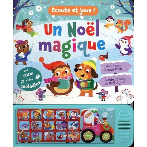 Bienvenue dans la magie de Noël ! Dans ce livre, les jeunes enfants embarquent dans un petit train, en compagnie du Père Noël. Direction la Laponie, pour découvrir la maison du Père Noël et ses amis, ici on décore la maison, là on prépare des biscuits de Noël et une coupelle de lait pour les rennes du Père Noël. Au marché de Noël, les passants se régalent de beignets en écoutant les petits chanteurs. Puis vient le moment si mystérieux du passage du Père Noël... Le module sonore (15 sons et 3 mélodies) propose un jeu très amusant : écouter un bruit et l'associer à son image. Si la réponse est bonne, une petite musique retentit.