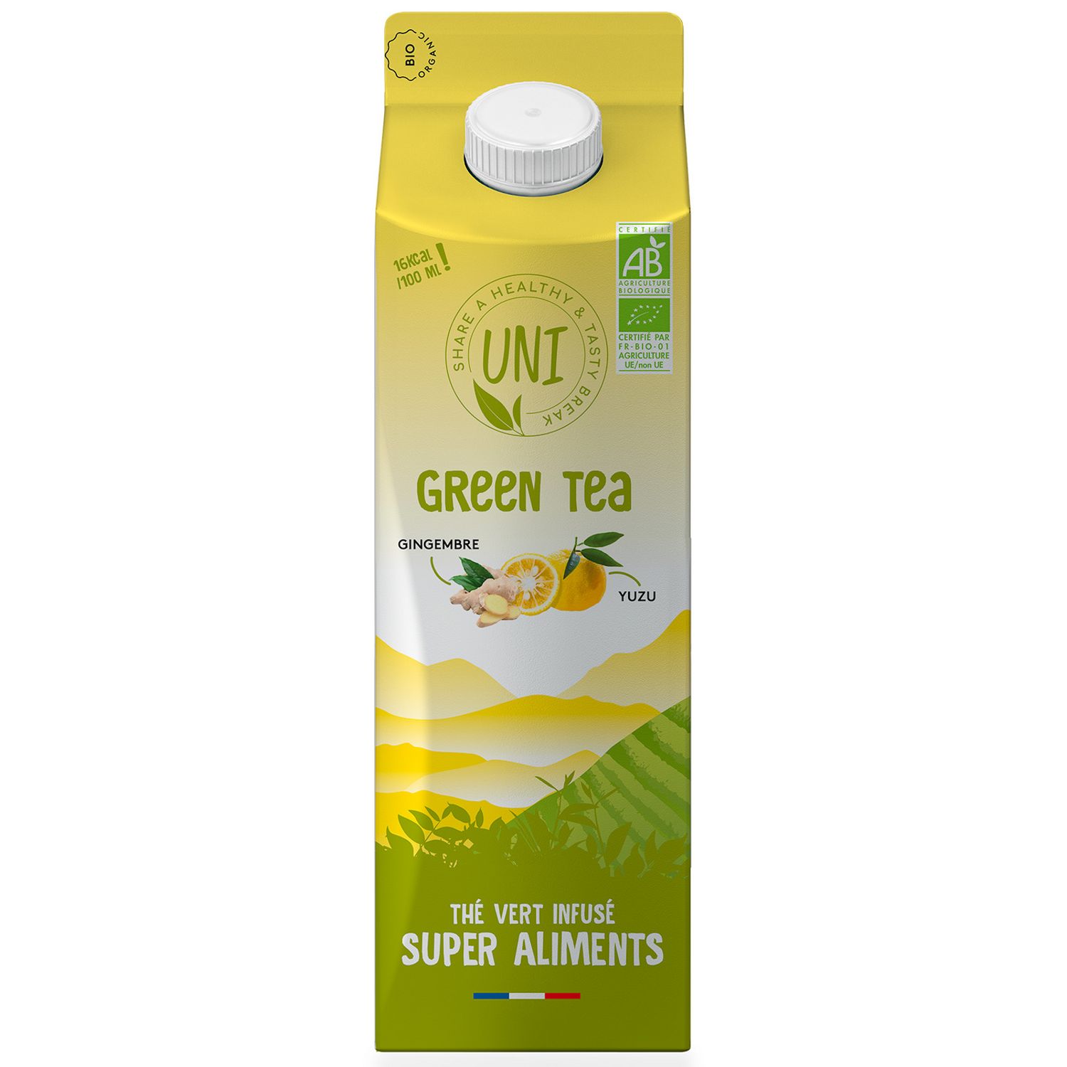 Infusion de thé vert* 92% (eau,thé vert*), miel*, jus de citron* 2,3% ,jus de yuzu* 0,5%, extraits de plantes* 0,07% (extrait de gingembre*). * ingrédients issus de l'agriculture biologique