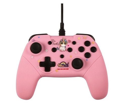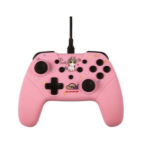 - Câble : 3 m - 2 sticks analogiques haute précision 3D (Polyshine) - Compatible PC (X input) - Boutons + - / home / capture d’écran / turbo - Prise en main ergonomique - Poignées anti-dérapantes nervurées - Design Rose / Licorne
