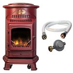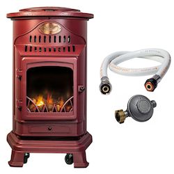 Poele à gaz 3,4 KW Rouge Effet poêle à bois Fonte véritable + Tuyau gaz + détendeur butane Provence UNIVERSAL