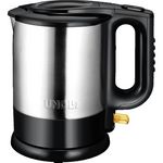 La bouilloire Unold 18015 est conçue pour un usage domestique, offrant une puissance de 2200 Watts et une capacité de 1,5 litre. Son design élégant en acier inoxydable noir s'intègre parfaitement dans une cuisine moderne. Elle est équipée d'un couvercle à ouverture par bouton-poussoir, d'une base rotative à 360°, d'un filtre anti-calcaire et d'un élément chauffant dissimulé pour un nettoyage facile. Pour votre sécurité, elle dispose d'un arrêt automatique en cas de surchauffe et d'une protection contre l'ébullition à sec. L'interrupteur marche/arrêt lumineux facilite son utilisation quotidienne.