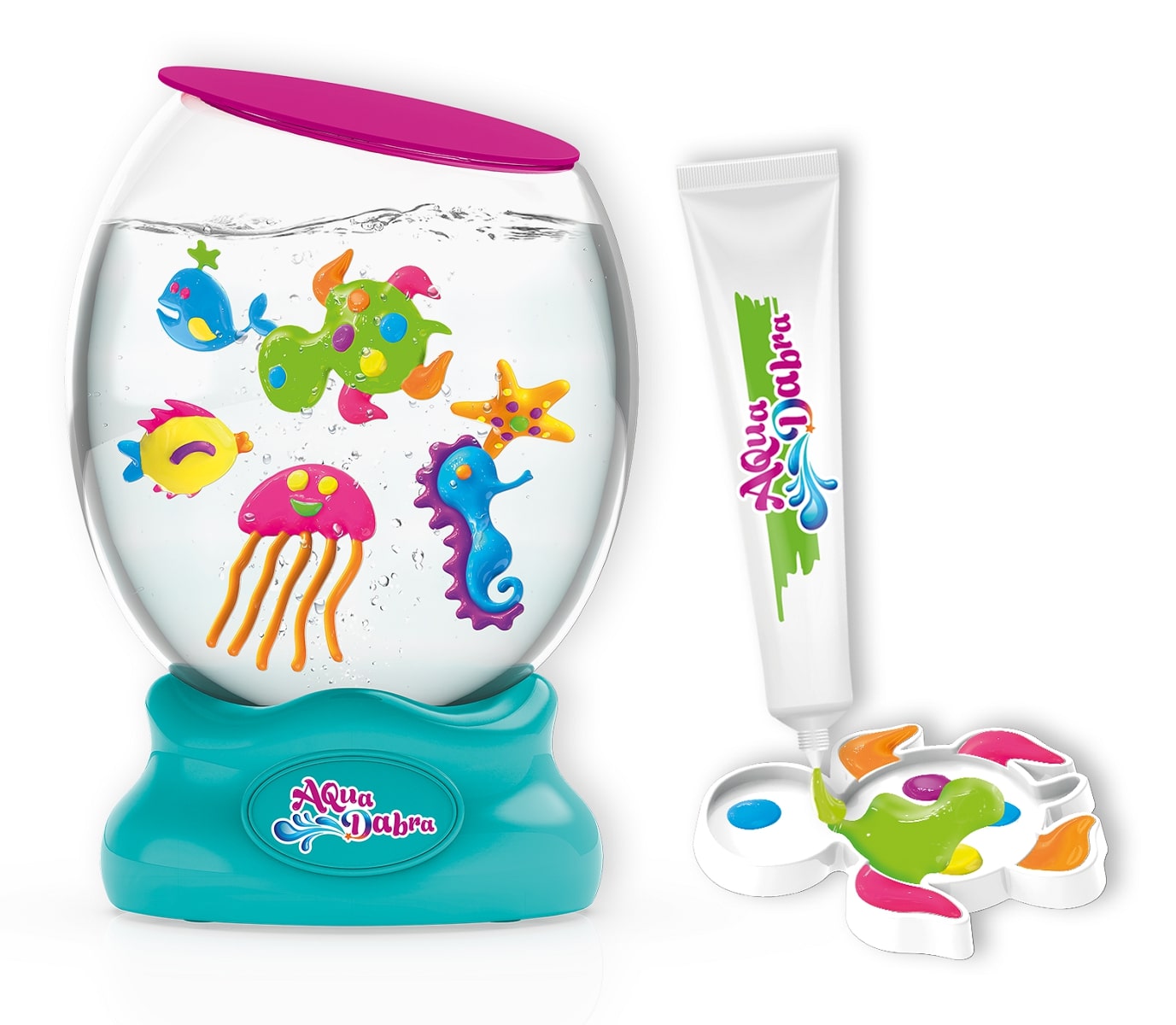 Crée tes propres créatures Aqua Magiques et expose-les dans ton aquarium à remous et à lumières. Grâce à la peinture spéciale et les moules inclus, tu peux créer des créatures en gel de différentes couleurs et les exposer dans ton aquarium rempli d'eau. Éteins la lumière, allume ton aquarium et admire tes créations qui bougent dans l'eau ! Aquadabra, c'est magique !