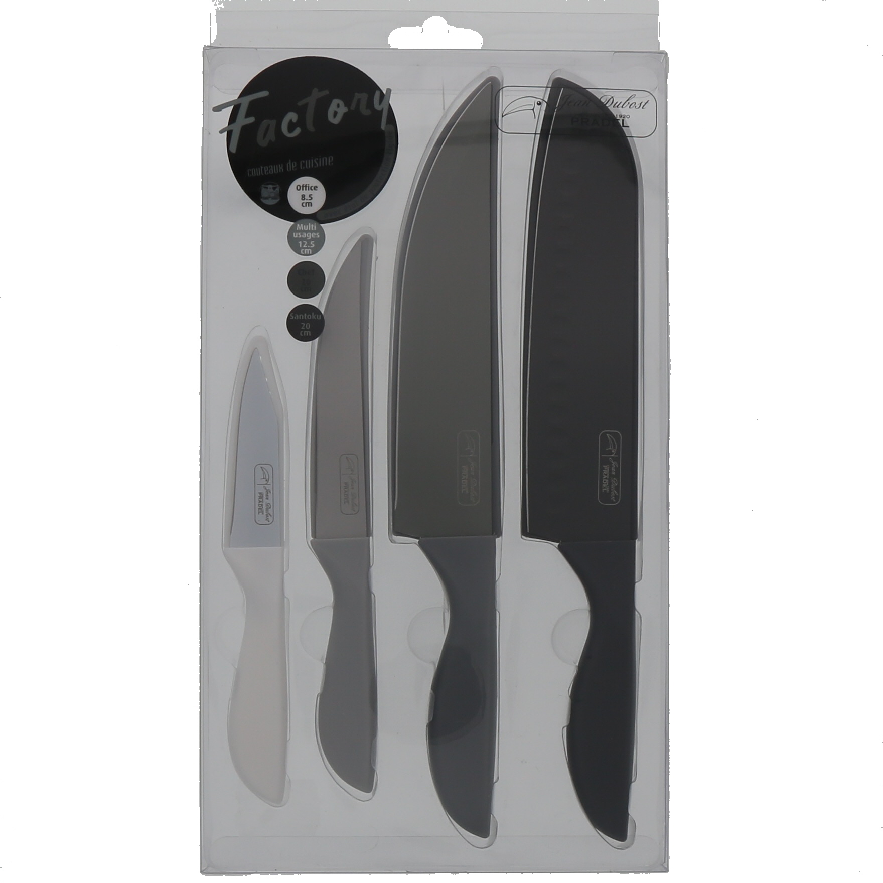 1 couteau office 8.5cm + 1 couteau multi usages 12.5cm + 1 couteau chef 20cm + 1 couteau santoku 20cm