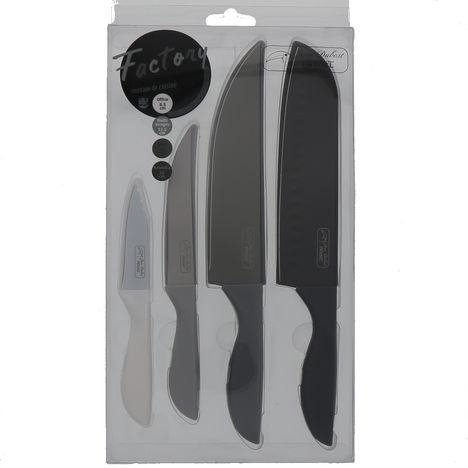 En savoir +Découvrez ce lot de 4 couteaux de cuisine en inox et déclinés dans un beau dégradé de gris ! Ce lot est composé de 1 couteau office 8.5cm + 1 couteau multi usages 12.5cm + 1 couteau chef 20cm + 1 couteau santoku 20cm. Manches en polypropylène. Dimensions : 19 x 2.5 x h 36 cm