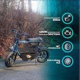 Avec sa vitesse maximale de 25 km/h et son autonomie allant jusqu'à 30 km, la THUNDER 160 vous permet de vous déplacer rapidement sans effort. Son moteur arrière de 350W (400W en crête) et sa batterie 36V / 7,8Ah garantissent une conduite fluide, même en montée (jusqu'à 15° d'inclinaison).