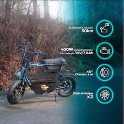 Robuste et pratique, elle supporte jusqu'à 120 kg et s'adapte à tous les gabarits. Les roues de 16 pouces avec chambre à air assurent une excellente stabilité, tandis que le double frein à disque vous offre un freinage puissant et sécurisé.