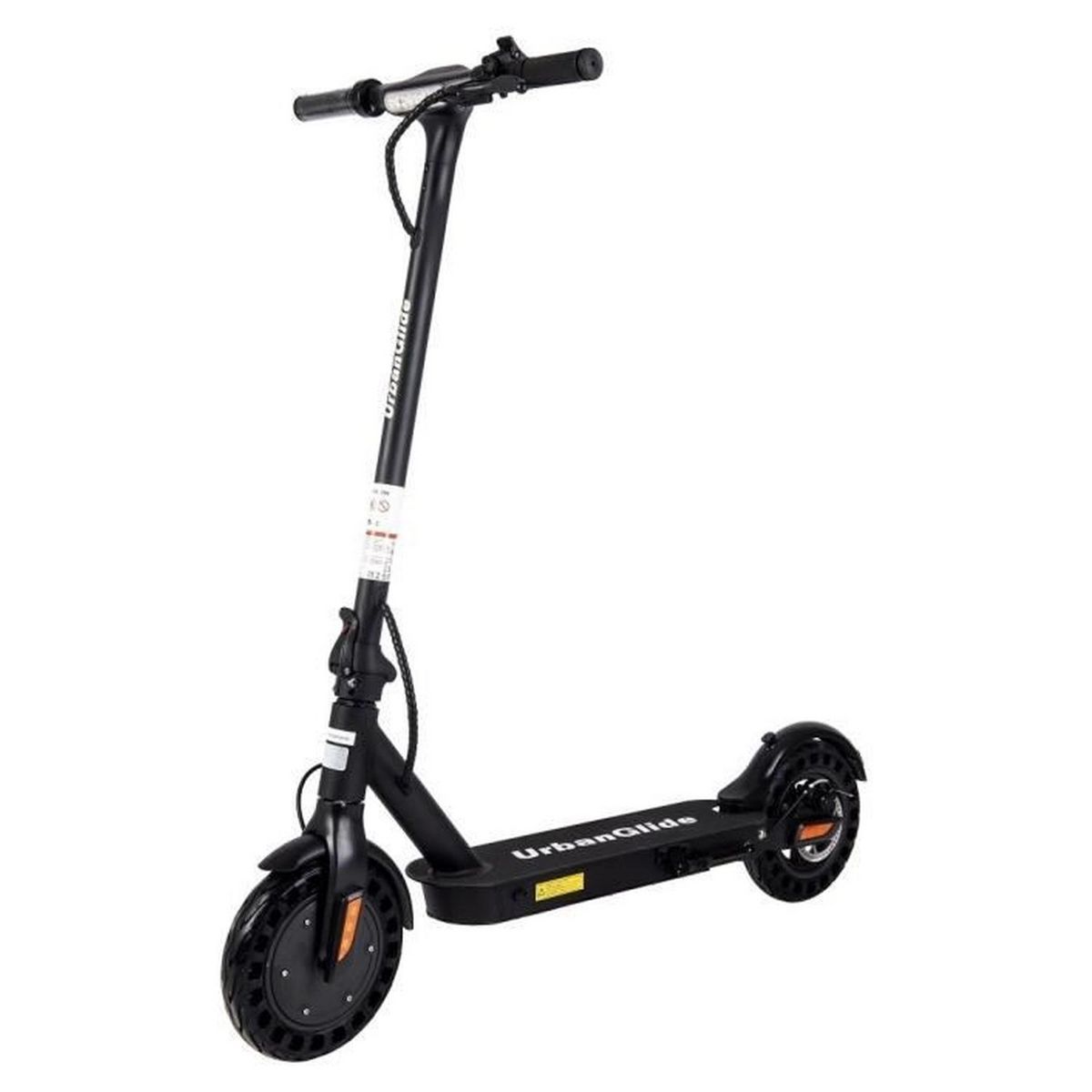 La trottinette électrique Ride 100 S de UrbanGlide possède une roues pleine à l'avant (increvable) en gomme de 10 pouces, une batterie amovible offrant une autonomie de 15 km, ainsi qu'un écran LED en couleur.