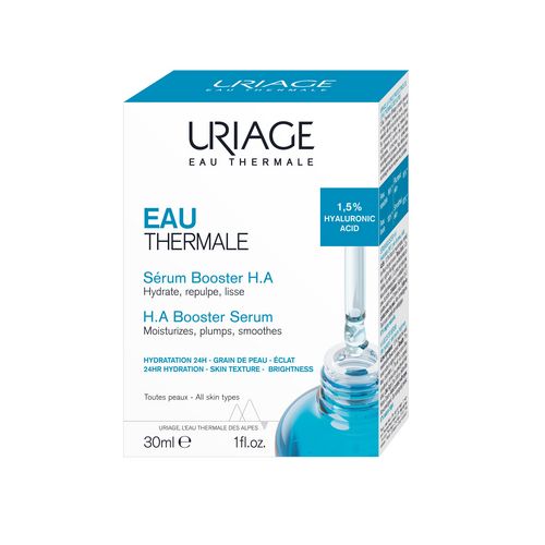 Formulé à base d'Eau Thermale d'Uriage et enrichi en acide hyaluronique pur et naturel (1,5 %) et en extrait de fleur de guimauve, le Sérum Booster H.A agit sur les signes de déshydratation (ridules, inconfort) et convient à tous les types de peaux même sensible. La peau est repulpée, lissée et lumineuse pour un véritable effet peau de pêche. Sa texture légère et non collante offre une pénétration rapide. Appliquer le sérum matin et soir en déposant 2 à 3 gouttes sur une peau parfaitement nettoyée et séchée.