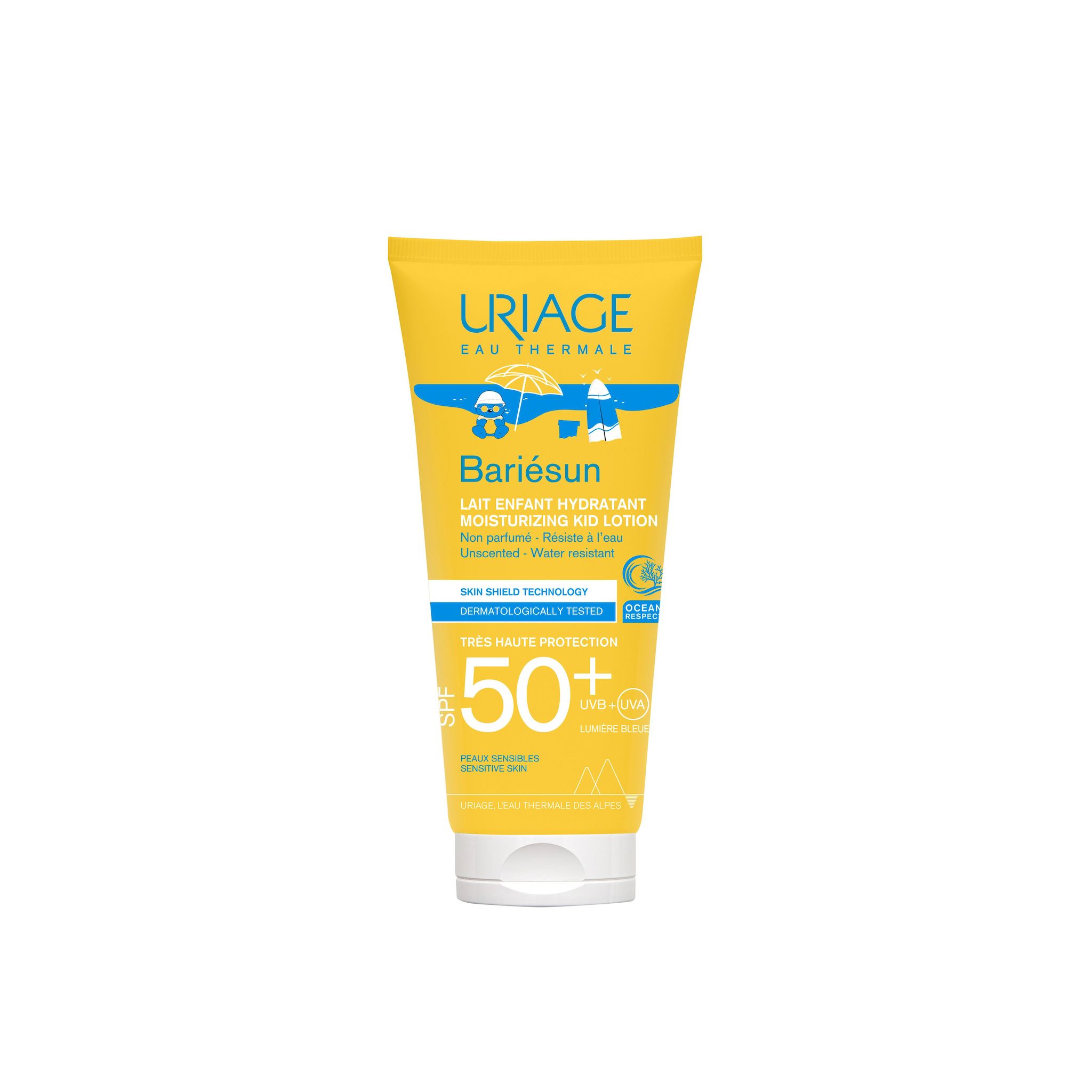 Eau Thermale d'Uriage ; Protection solaire ; Bariésun ; UVA ; UVB ; Lumière bleue ; Testé sous contrôle dermatologique ; Brevet Bariésun ; Brevet Télomères Protect ; Complexe filtrant