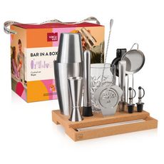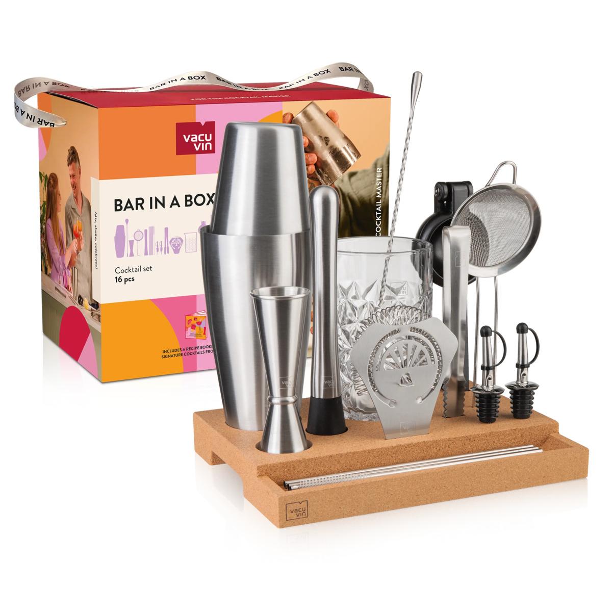 Vacu Vin 7889365 Appel à tous les amateurs de cocktails ! Le Vacu Vin Bar in a Box Master (set de 16 pièces pour cocktails) est conçu pour ceux qui souhaitent perfectionner leurs talents de mixologue. Fabriqué en acier inoxydable de qualité supérieure et développé en collaboration avec le barman pro