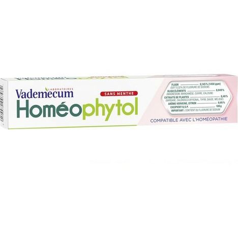 La formule exclusive du dentifrice Vademecum Homéophytol contient des extraits de plantes aux vertus bienfaisantes. L'essence de verveine et de citron vous procure une agréable sensation de fraîcheur. Elle contient aussi du fluor pour aider à renforcer efficacement l'émail de vos dents. L'absorption de menthe contenue dans la plupart des dentifrices peut être déconseillée lors d'un traitement homéopathique. C'est pourquoi les Laboratoires Vademecum ont conçu le dentifrice Homéophytol garanti sans menthe.