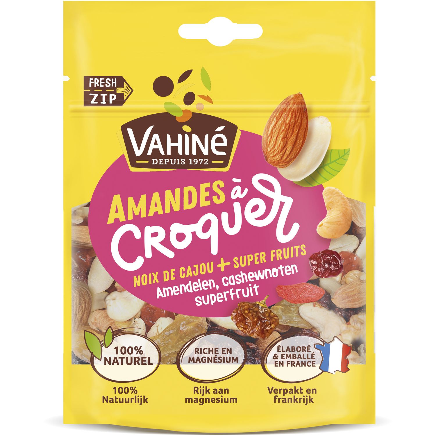 Rijk aan kalium. Verpakt in Frankrijk. Fresh ZIP. Psst... Mélange naturellement riche en potassium, fibres & manganese..