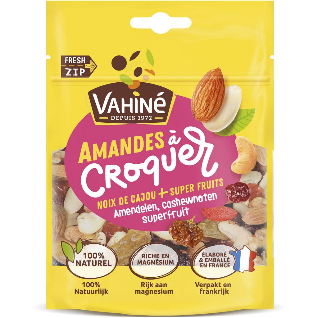 Une petite faim ? Vahiné est là ! Une gamme de mélanges gourmands & sains… à croquer à tout moment !!. Une délicieuse recette:- Sans colorant ni conservateur- Elaborée et emballée en France Mélange de fruits secs