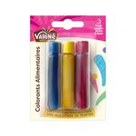Préparations de colorants alimentaires liquides jaune, rouge, et bleu à usage ménager.