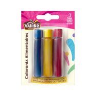 Nombre de gouttes à ajouter par colorant * : x12 Couleur rougex12 Couleur jaunex10 Couleur bleue *pour environ 100g de glaçage blanc (100g de sucre glace + ½ blanc d'oeuf) ou 125g de pâte d'amandes neutre. Utiliser selon les dosages suggérés. 3 couleurs pour un EVENTAIL DE TEINTES** :** Les teintes proposées ont une valeur informative, non contractuelle.Couleurs souhaitéesNombre de gouttes de chaque colorant* x3 Bleu x4 Jaune : Vert Clairx2 Bleu x10 Jaune : Vert Pistachex3 Bleu x5 Jaune : Vert Menthex12 Bleu x2 Jaune : Turquoisex11 Jaune x4 Rouge : Orangex5 Jaune x6 Rouge : Corailx6 Bleu x9 Rouge : Violetx1 Bleu x4 Rouge : Mauvex2 Bleu x7 Jaune x6 Rouge : Marron clair