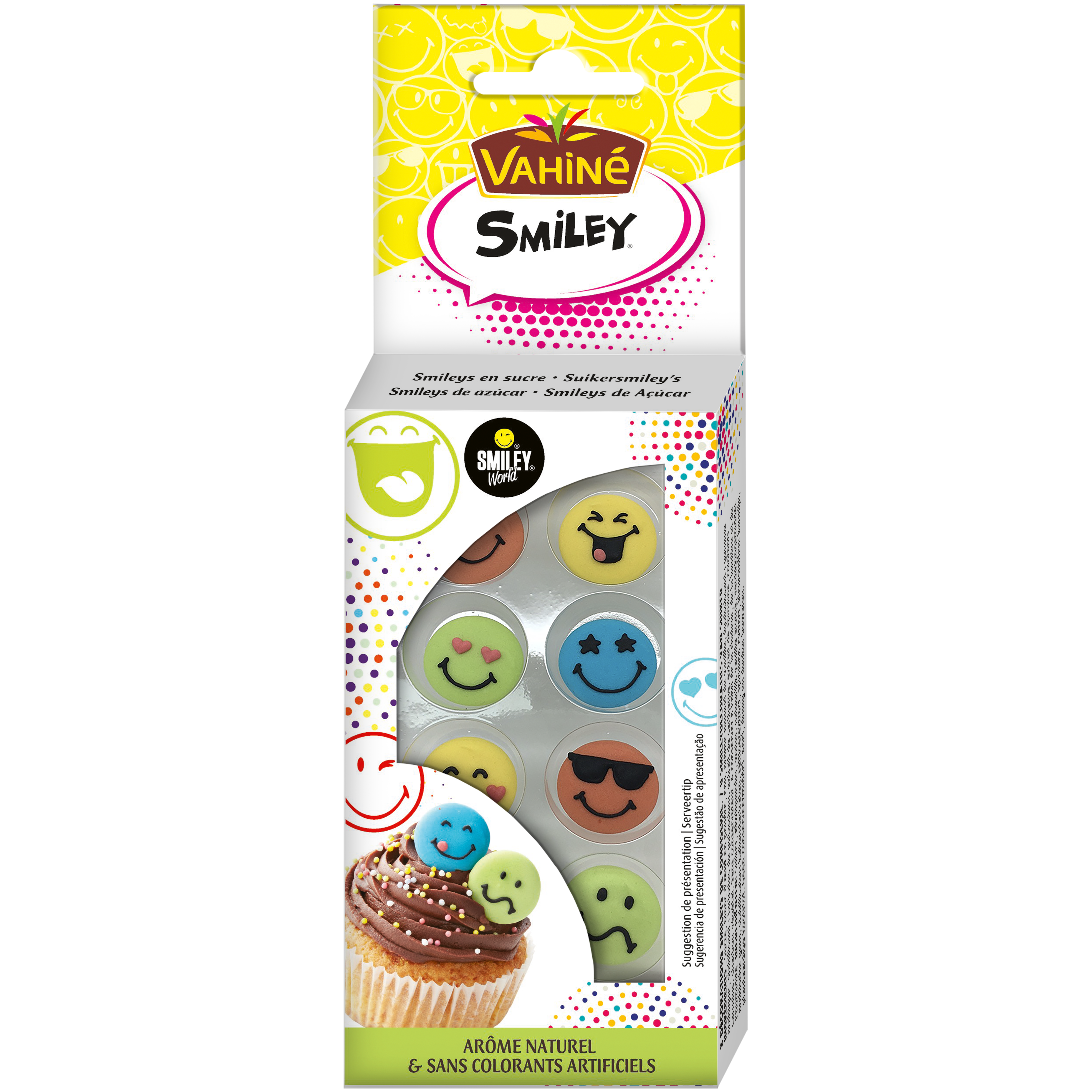 Des décorations smileys en sucre à l'arôme naturel, sans colorants artificiels, pour plus de personnalisation, de fun et de partage !