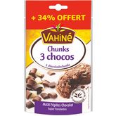 CONSERVATION: Le chocolat est un produit sensible aux écarts de température. Il est possible qu'ilblanchisse. Ce changement de couleur n'altère en rien le goût et la qualité du produit. *Conformément à la réglementation en vigueur. Cookies aux Chunks 3 ChocosPour 16 cookies : 100g de chocolat noir - 100g de beurre - 200gde farine - 1/2 sachet de Levure Chimique Vahiné - 1 pincée de sel -140g de cassonade - 1 sachet de Sucre Vanillé Vahiné - 1 oeuf -1 sachet de Pépites Chunks 3 Chocos.Préparation : 10 min. Cuisson : 9-11 min.Préchauffezvotre four à 200°C (th. 6/7)1 Faites fondrele chocolat en morceauxdans le beurre fondu chaudpendant 30 sec. hors du feu.Mélangez et laissez tiédir.2 Mélangezla farine avec 1/2 sachetde levure, le sel, la cassonade etle Sucre Vanillé, incorporez l'oeuf.3 Versezles Chunks 3 chocolats.Formez 16 boules identiques.4 Répartissezles boules aplaties surune plaque anti-adhésive.Enfournez 9 à 11 min.Laissez refroidir lescookies avant de lesdécoller.