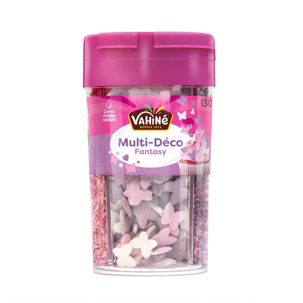 Ingrédients : perles de confiserie 3 couleurs : sucre, amidon de BLE et de maïs, jus de betterave rouge concentré, sirop de glucose, agent d'enrobage: cire d'abeille, concentré de spiruline, huiles végétales (noix de coco, colza). / vermicelles de confiserie colorés : sucre, sirop de glucose, huiles végétales (noix de coco, colza), amidon de maïs, jus de betterave rouge concentré, émulsifiant : lécithine de tournesol, concentrés végétaux (pomme, cassis, radis). / coeurs de confiserie : sucre, farine de riz, beurre de cacao, épaississant : gomme adragante, colorant : carmins, arôme naturel de vanille. / papillons de confiserie : sucre, farine de riz, beurre de cacao, épaississant : gomme adragante, colorant : anthocyanes, jus de betterave concentré, arôme naturel de vanille.
