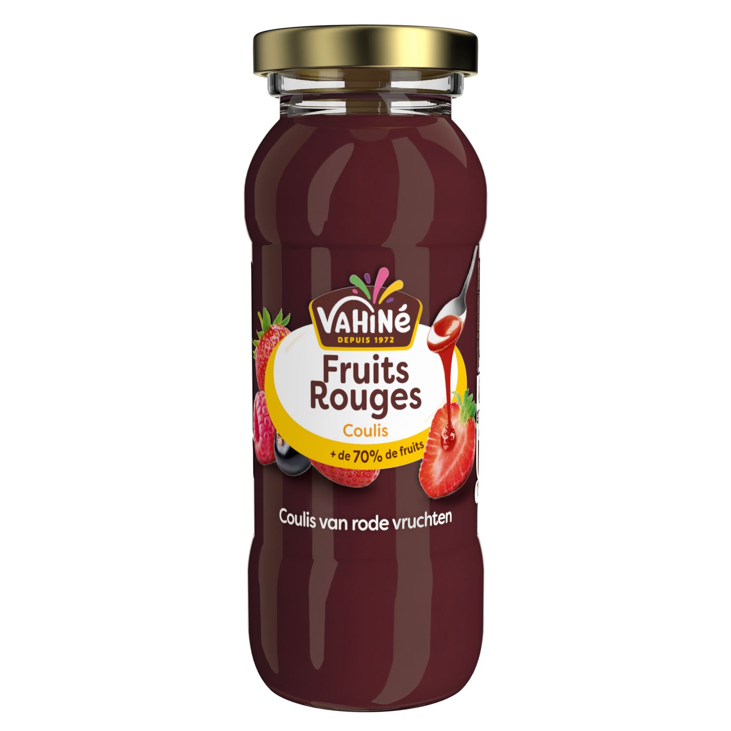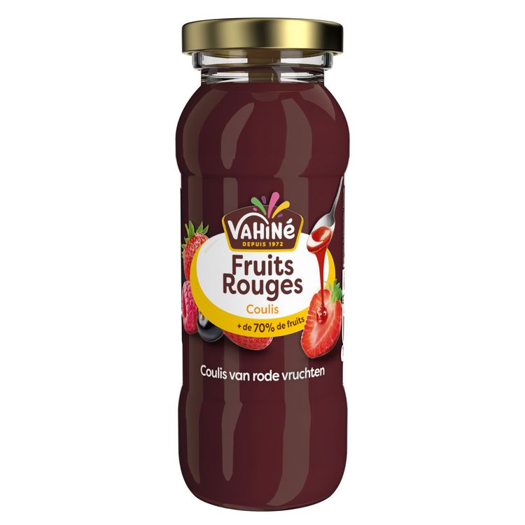 Ingrédients : purée de fraise (49,7%), purée de framboise (20%), eau, sucre, amidon modifié, purée de cassis (2,2%).