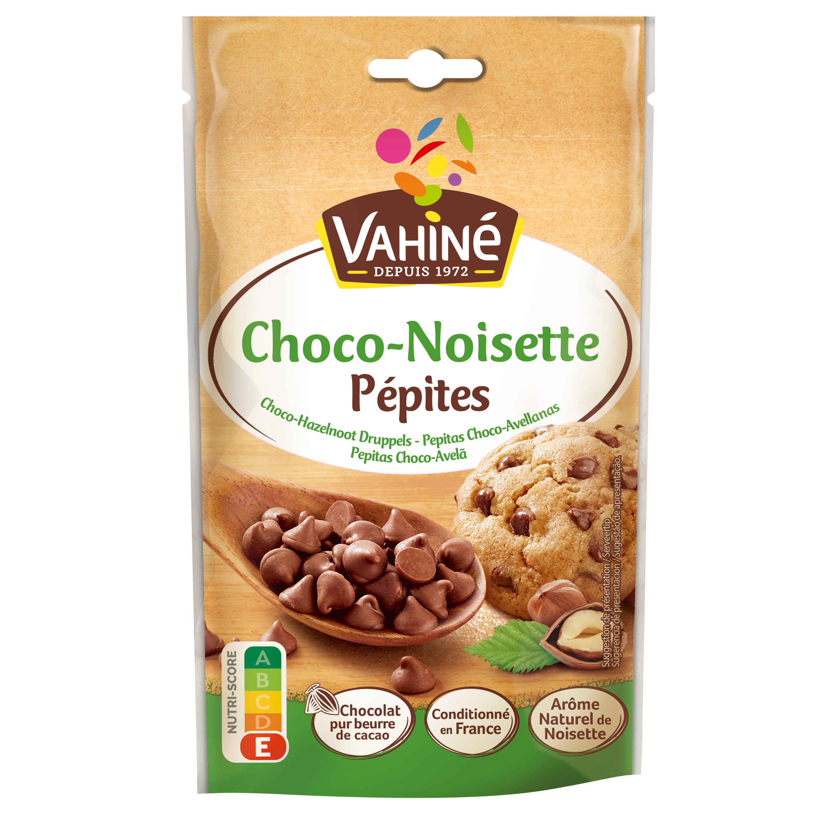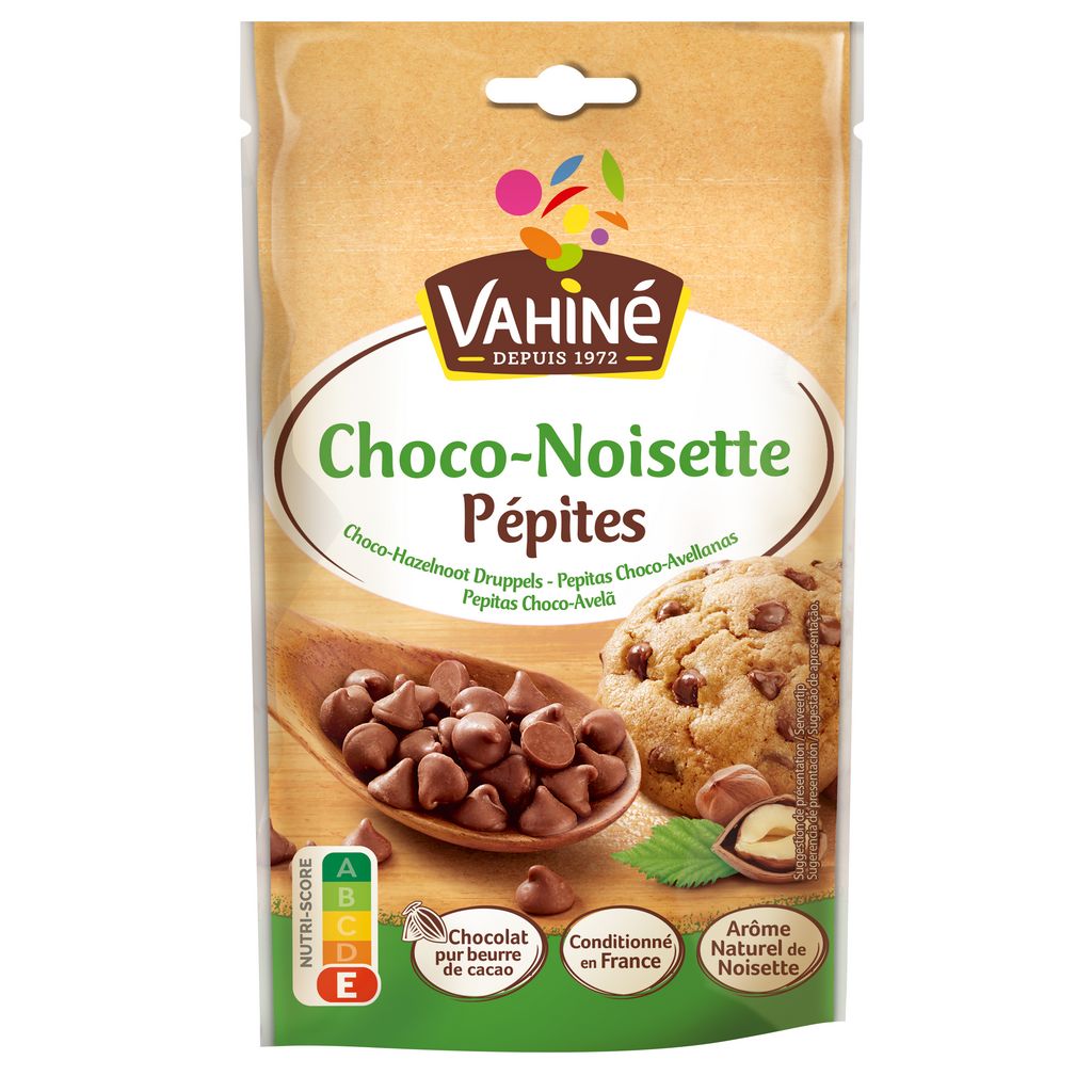 Des pépites choco-noisette au chocolat pur beurre de cacao, à l'arôme naturel de noisette, conditionné en France.