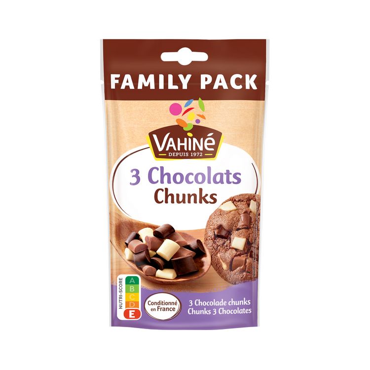 Des pépites chunks 3 chocos au chocolat en format familial, conditionnées en France.