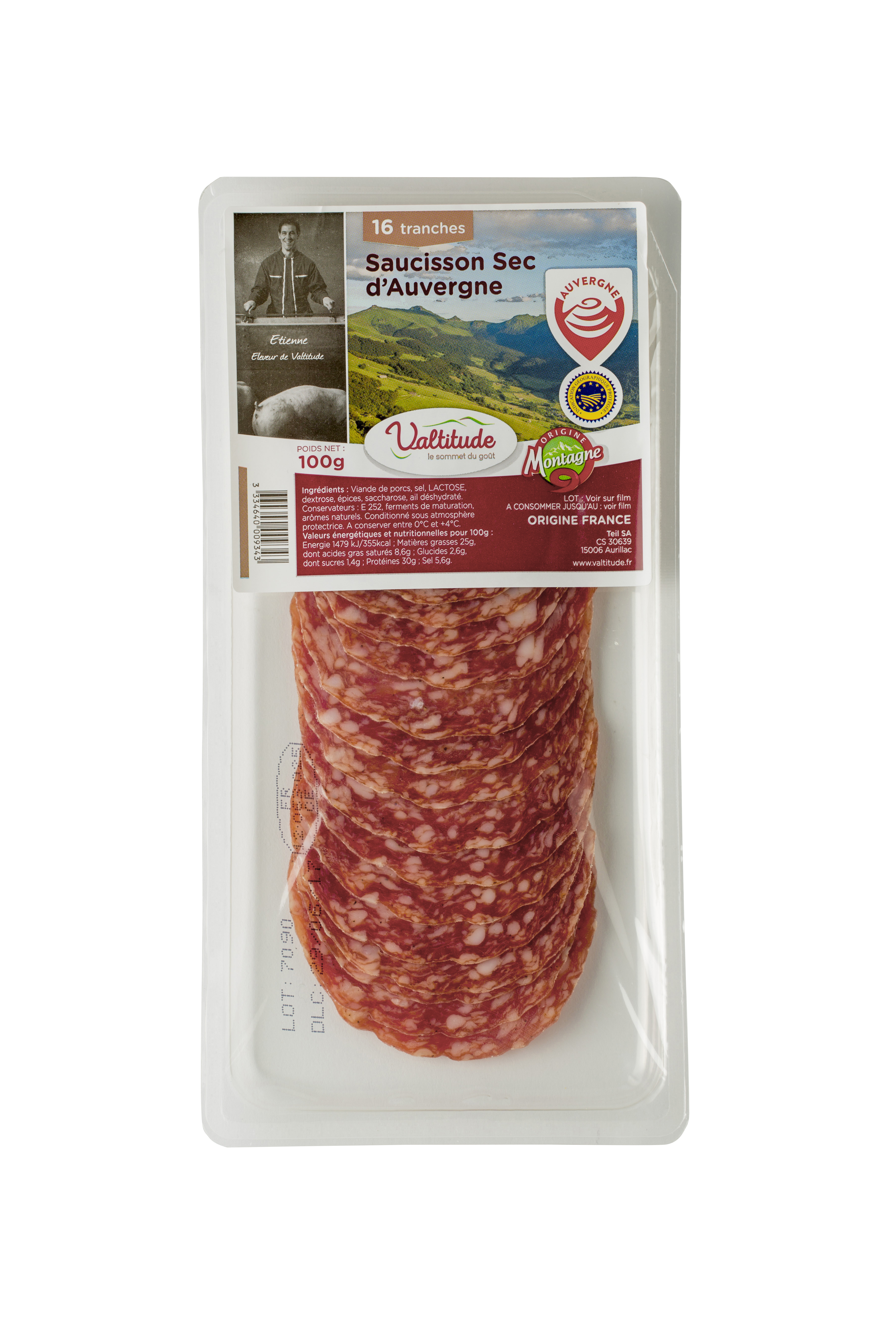boyau naturel , flore naturelle de surface. sans colorant ni arôme artificiel. produit IGP Auvergne, élaboré à Aurillac (15) à partir de porcs né et élevés dans le massif central. appellation produit de Montagne