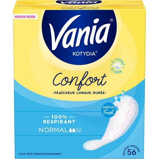 VANIA KOTYDIA CONFORT NORMAL FRESH X56 Confort Les protège-lingeries 100% respirants & incroyablement confortables de Vania® Légèrement parfume Cœur absorbant composé de fibres cellulosiques d'origine végétale et de micro billes ultra-absorbantes Voile doux à l'extrait de coton, en contact avec la peau, testé dermatologiquement Couche inférieure et intermédiaire en polymères, 100% respirantes Nos Engagements Toutes ces couches sont constituées de composants sélectionnées pour leur niveau élevé de tolérance pour la peau. Fibres non blanchies au chlore élémentaire. Tenue optimale Ajustement parfait Sensation fraîcheur Le Protège-Lingerie : votre geste fraîcheur Les protège-lingerie Vania® Kotydia® vous accompagnent tout au long de votre cycle. Vous pouvez porter vos protège-lingeries Vania® Kotydia® comme une protection quotidienne ou durant votre cycle (en début et fin de règles, ou en complément d'un tampon)