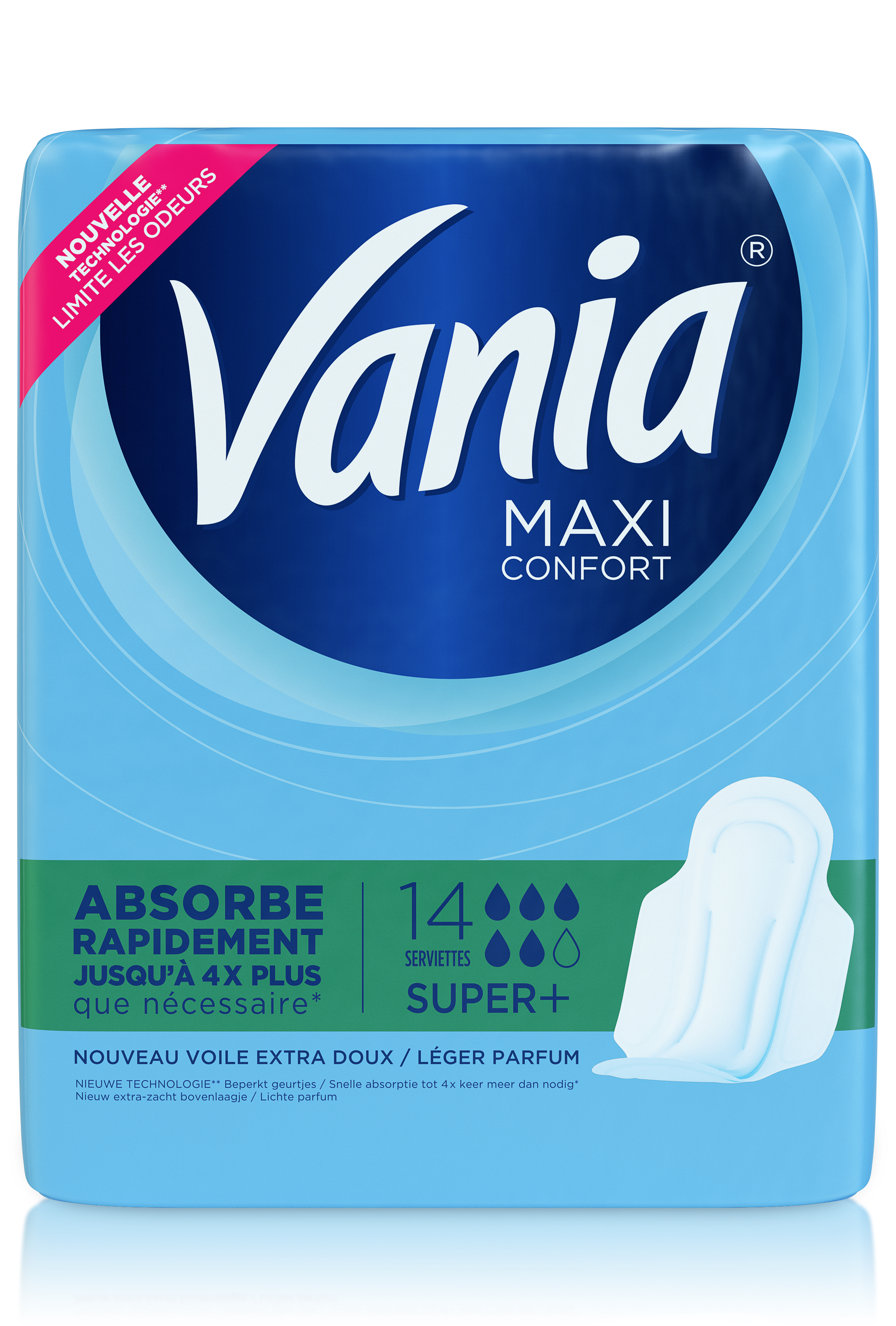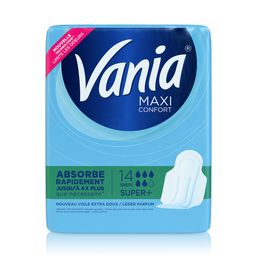 Serviettes Hygiéniques Maxi Super Les serviettes Vania Maxi vous offrent une protection optimale et aident à limiter les odeurs. Grâce à une technologie absorbante associée à un léger parfum, les serviettes Vania Maxi absorbent rapidement jusqu’à 4 fois plus que nécessaire* tout en limitant les odeurs. Légèrement parfumé. Ce parfum a été rigoureusement sélectionné pour répondre aux exigences de sécurité de l’IFRA (association internationale des parfums). Tous les composants ont été sélectionnés pour leur niveau élevé de tolérance pour la peau et les fibres sont non blanchies au chlore élémentaire. Voile doux testé sous contrôle dermatologique. Composées de fibres ultra souples et d’un nouveau voile extra doux, les serviettes Vania Maxi vous procurent un confort incroyable, le jour comme la nuit.