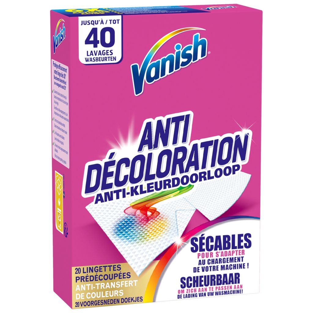 Convient à tous les cycles de lavage, à toutes les températures et à tous les types de lave-linge. Toujours suivre les instructions d’utilisation présentes sur les emballages Vanish. Tenir hors de portée des enfants. Se laver les mains soigneusement après utilisation. *Certains vêtements peuvent rendre plus de couleurs que d’autres. En fonction du type de vêtements lavés (fibres, couleurs, âge, etc.), vous devez adapter le nombre de lingettes utilisées.