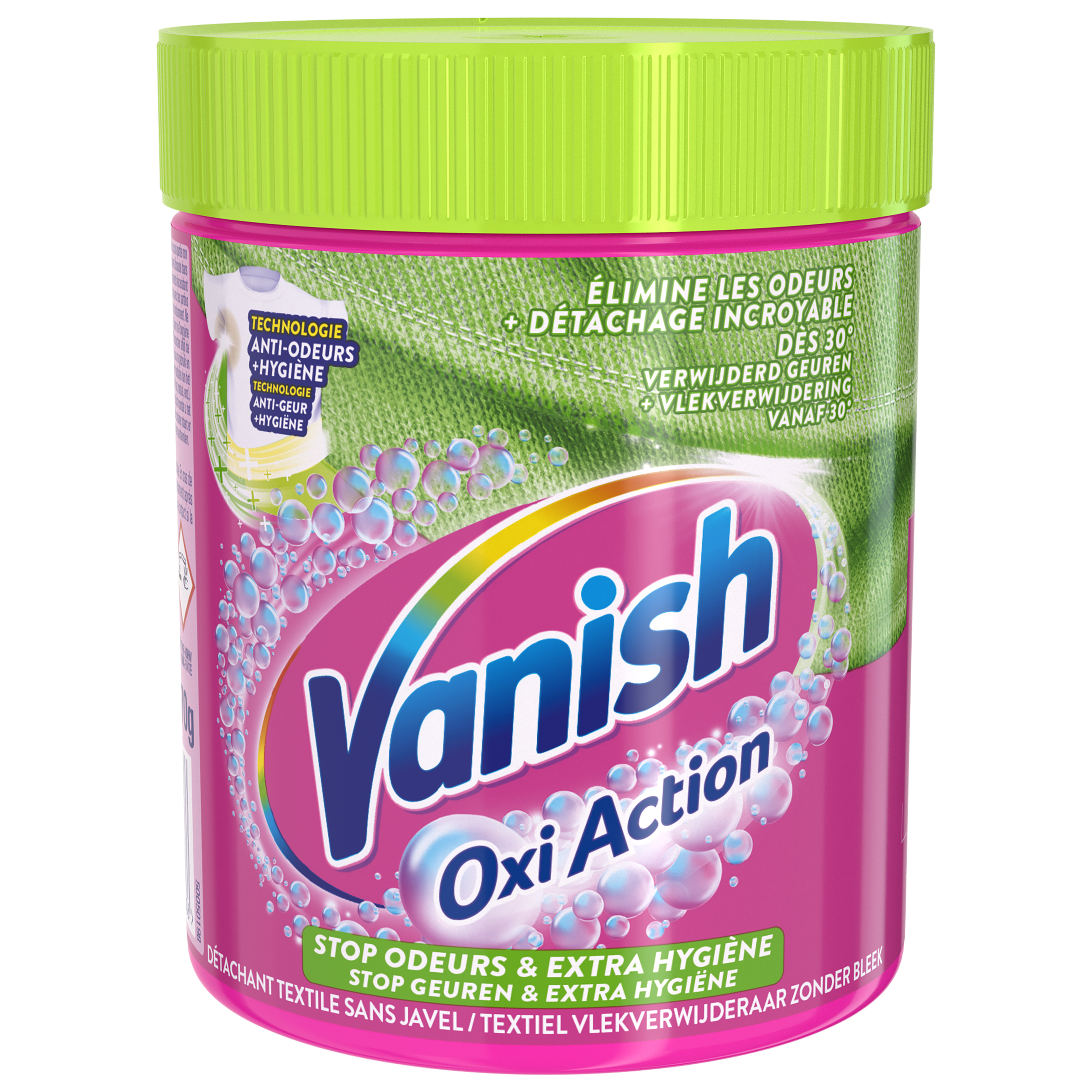 En plus de son action détachante, la poudre Vanish Oxi Action offre également une action anti-décoloration, anti-odeurs, et une hygiène parfaite.