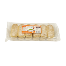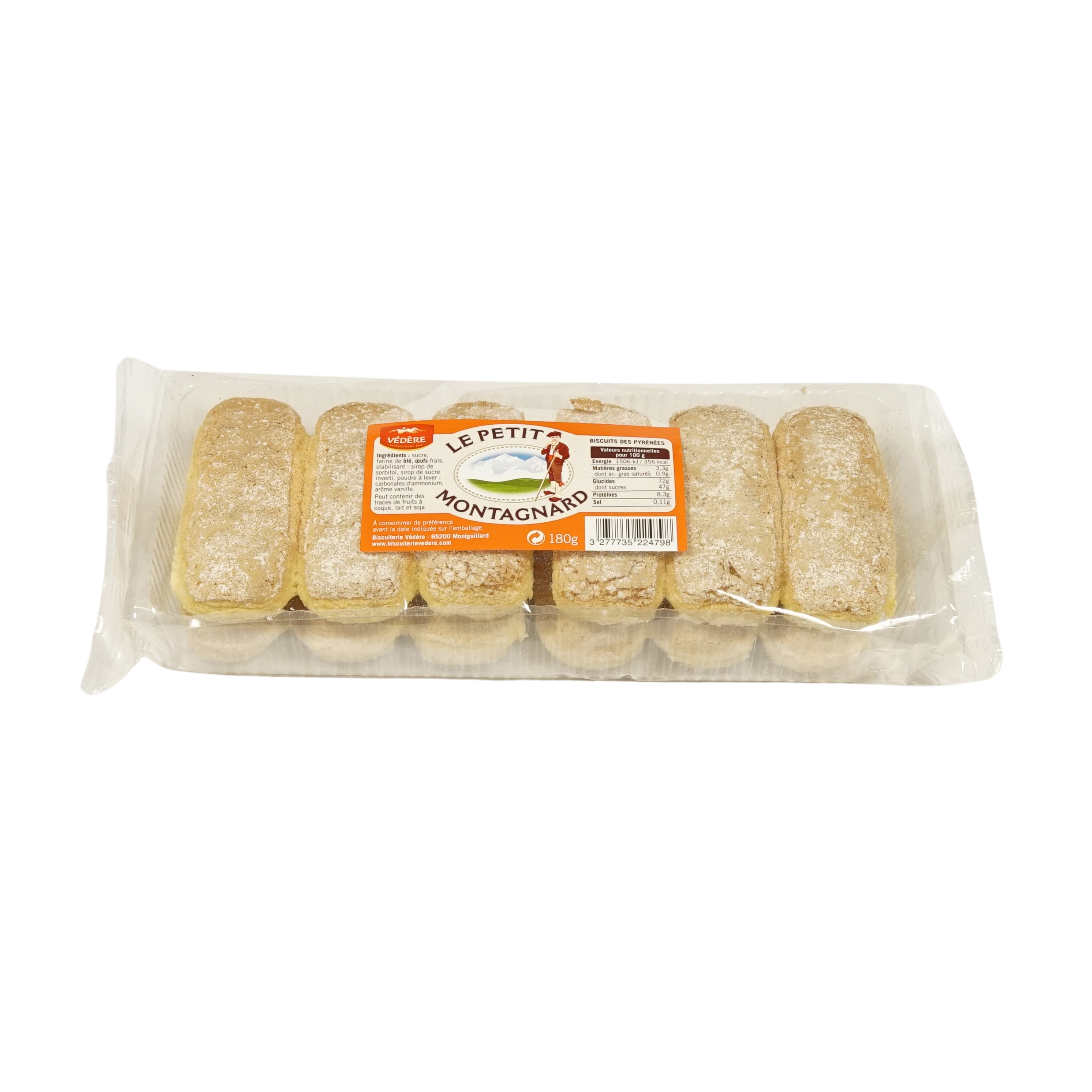 Sucre, farine de blé, œufs frais, stabilisant : sirop de sorbitol, sirop de sucre inverti, poudre à lever : carbonates d’ammonium, arôme vanille.