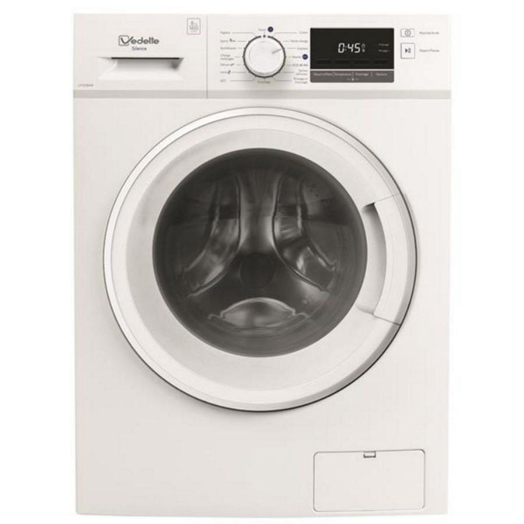 Vedette LFVQ184W Lave-linge hublot Vedette LFVQ184W doté de 16 programmes dont Laine, Rapide 60 minutes et Hygiène : ce programme élimine de vos vêtements et masques les principaux virus et jusqu'à 99,9% des bactéries grâce à une phase de lavage de 30 minutes à une température légèrement supérieure à 60° C. Programme Favori : enregistrez en toute simplicité les paramètres du cycle de lavage que vous utilisez le plus souvent (type de textile, température, vitesse d'essorage et options) pour accéder directement à votre programme favori. Options Prélavage et Rinçage plus : cette option permet d'ajouter un rinçage supplémentaire pour éliminer toutes les traces de lessive résiduelles limitant ainsi les risques d'allergie. Idéal pour les peaux sensibles. Moteur induction : la technologie du moteur à induction offre le double avantage du silence et la réduction de la consommation énergétique pendant le cycle.