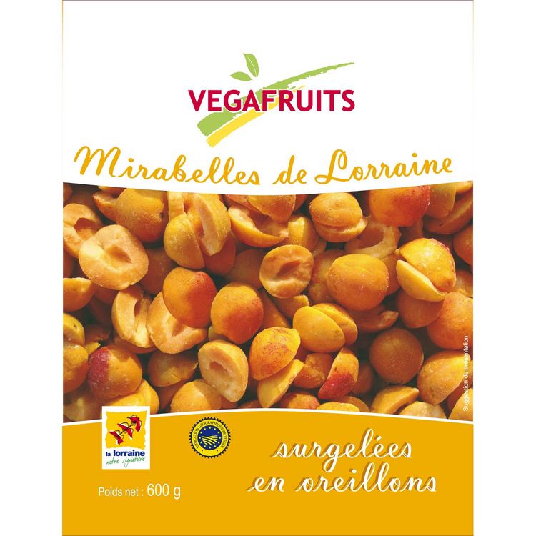 Mirabelles de Lorraine dénoyautées et surgelées individuellement en oreillons en sac de 600g.