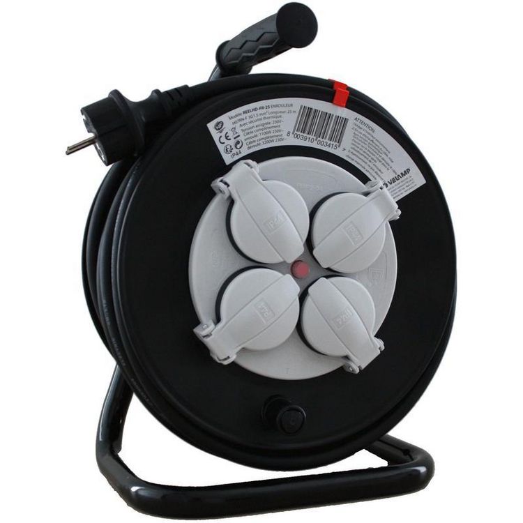 Enrouleurs de 25 mètres avec fermoirs protège-prises, idéal pour les chantiers en extérieur.Câble HO7 RN-F 3G1,5mm².Avec disjoncteur thermique.Puissance maxi câble complétement enroulé : 1100 Watts.Puissance maxi câble complétement déroulé : 3200 Watts.IP44.