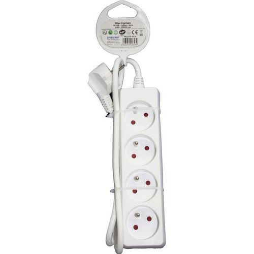 Multiprise avec 4 prises 2 pôles + terre 2P+T.Bloc de 10 à 16 Ampères.230 Volts.3500 Watts maximum.Cordon de 1,2 mètres.HO5VVF-3G1.