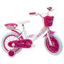 Vélo 14 Fille Lolli Girl pour enfant de 95/110 cm - Cadre Acier surbaissé pour enjambement aisé - Direction en nylon et pédalier - Roue libre monovitesse - Freins avant et arrière Calliper - Selle réglable - Carter de chaîne intégral - Gardes boue et poignées spécifiques pour augmenter la protection de l'enfant - Jantes à rayons - Pneus gonflables blancs - Stabilisateurs (montage sans outil) - Panier avant et coffre arrière - Avertisseur sonore - Eclairage à piles fournies